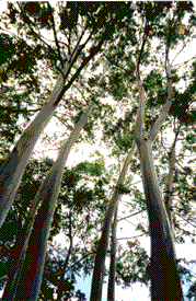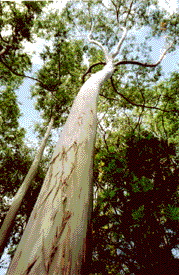 In the rain forest we found these rainbow eucalyptus trees with their multi-colored bark and interesting swirling top branches.