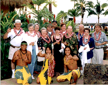 Here's the whole motley crew at the luau--all twelve of us with our leis, and three dancers giving the Hawaiian friendly "hang loose" gesture. It was a great trip!!